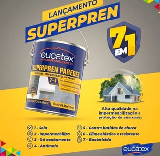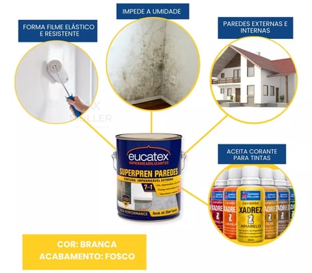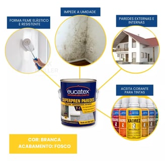 É uma pintura acrílica impermeável, elástica e robusta que dá proteção às paredes externas e internas. Ideal contra fissuras e batidas de chuva. Formulada com tecnologia inovadora que atribui ao produto uma película elástica e flexível, boa cobertura e durabilidade. Aditivada com Antimofo e Bactericidas. Pode ser usado como selador, impermeabilizante e acabamento.